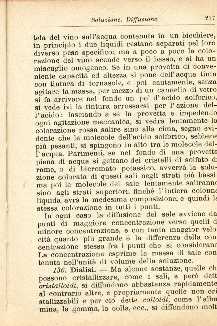 tela del vino sull'acqua contenuta in un bicchiere, in principio i due liquidi restano separati pel loro diverso peso specifico; ma a poco a poco la colorazione del vino scende verso il basso, e si ha un miscuglio omogeneo. Se in una provetta di conveniente capacità ed altezza si pone dell'acqua tinta con tintura di tornasole, e poi cautamente, senza agitare la massa, per mezzo di un cannello di vetro si fa arrivare nel fondo un po' d' acido solforico, si vede ivi la tintura arrossarsi per l'azione dell'acido: lasciando a sé la provetta e impedendo ogni agitazione meccanica, si vedrà lentamente la colorazione rossa salire sino alla cima, segno evidente che le molecole dell'acido solforico, sebbene più pesanti, si spingono in alto tra le molecole dell' acqua. Parimenti, se nel fondo di una provetta piena di acqua si gettano dei cristalli di solfato d: rame, o di bicromato potassico, avverrà la soluzione colorata di questi sali negli strati più bassi ma poi le molecole del sale lentamente salirannc sino agli strati superiori, finché l'intiera colonnf liquida avrà la medesima composizione, e quindi li stessa colorazione in tutti i punti.