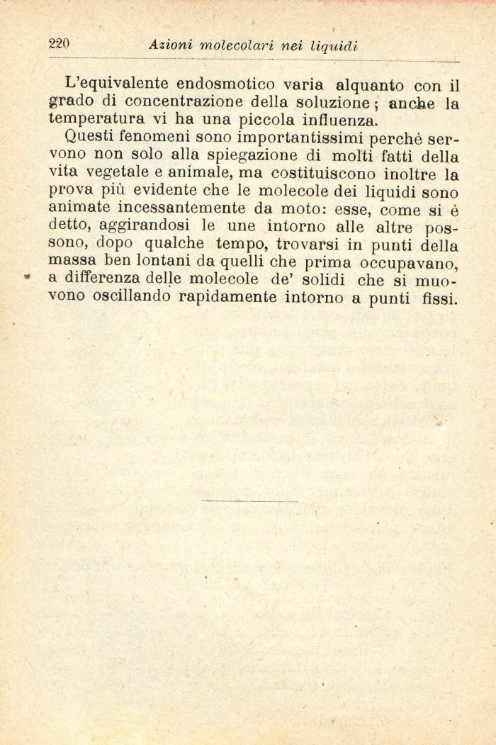 Questi fenomeni sono importantissimi perchč servono non solo alla spiegazione di molti fatti della vita vegetale e animale, ma costituiscono inoltre la prova pił evidente che le molecole dei liquidi sono animate incessantemente da moto: esse, come si č detto, aggirandosi le une intorno alle altre possono, dopo qualche tempo, trovarsi in punti della massa ben lontani da quelli che prima occupavano, « a differenza delle molecole de' solidi che si muovono oscillando rapidamente intorno a punti fģssi.
