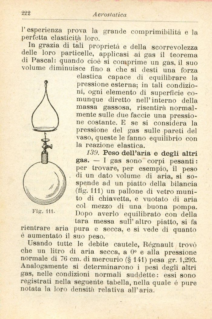 139. Peso dell'aria e degli altri gas. — I gas sono corpi pesanti : per trovare, per esempio, il peso dì un dato volume di aria, si sospende ad un piatto della bilancia (fig. Ili) un pallone di vetro munito di chiavetta, e vuotato di aria col mezzo di una buona pompa.