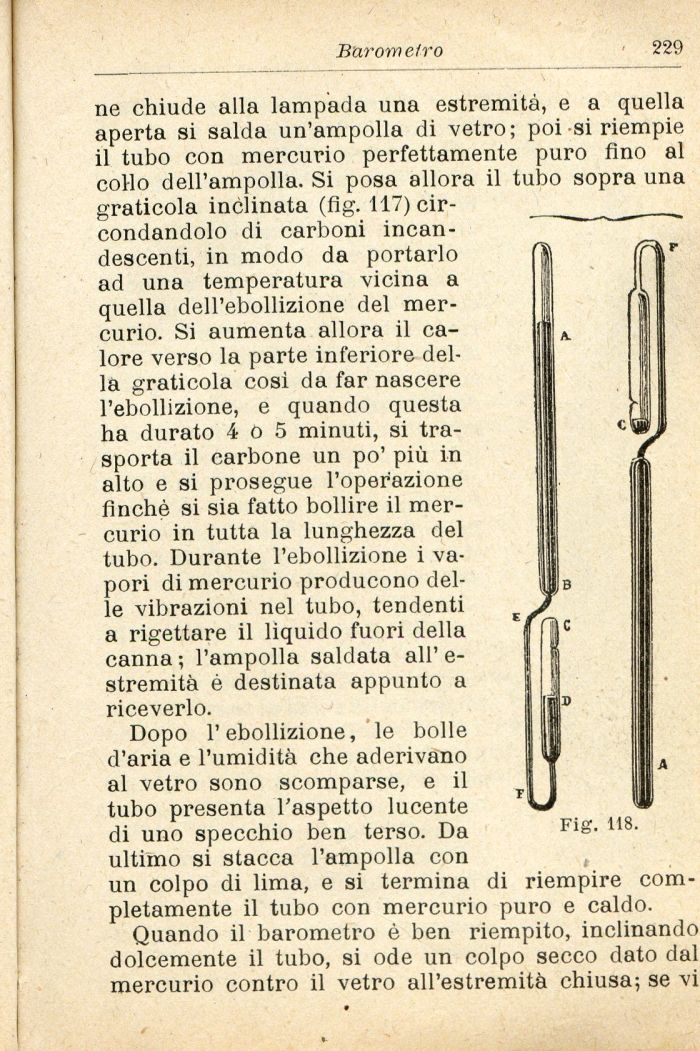 ne chiude alla lampada una estremità, e a quella aperta si salda un'ampolla di vetro; poi-si riempie il tubo con mercurio perfettamente puro fino al collo dell'ampolla. Si posa allora il tubo sopra una graticola inclinata (fig. 117) circondandolo di carboni incandescenti, in modo da portarlo ad una temperatura vicina a quella dell'ebollizione del mercurio. Si aumenta allora il calore verso la parte inferiore della graticola così da far nascere l'ebollizione, e quando questa ha durato 4 o 5 minuti, si trasporta il carbone un po' più in alto e si prosegue l'operazione finché si sia fatto bollire il mercurio in tutta la lunghezza del tubo. Durante l'ebollizione i vapori di mercurio producono delle vibrazioni nel tubo, tendenti a rigettare il liquido fuori della canna ; l'ampolla saldata all' e-stremità è destinata appunto a riceverlo.