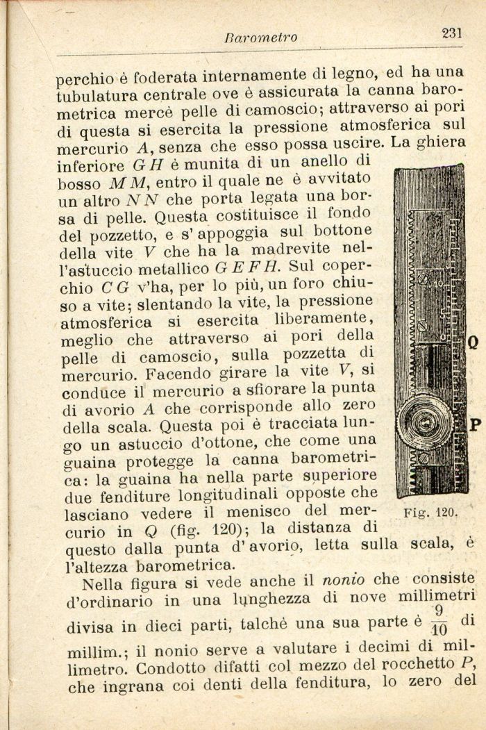 perchio é foderata internamente di legno, ed ha una tubulatura centrale ove è assicurata la canna barometrica mercè pelle di camoscio; attraverso ai pori di questa si esercita la pressione atmosferica sul mercurio A, senza che esso possa uscire. La ghiera inferiore GH è munita di un anello di bosso MM, entro il quale ne è avvitato un altro N N che porta legata una borsa di pelle. Questa costituisce il fondo del pozzetto, e s'appoggia sul bottone della vite V che ha la madrevite nell'astuccio metallico G E FH. Sul coperchio C G v'ha, per lo più, un foro chiù- 1fi so a vite; slentando la vite, la pressione GHIll atmosferica si esercita liberamente, meglio che attraverso ai pori della pelle di camoscio, sulla pozzetta di _ mercurio. Facendo girare la vite V, si ¦ conduce il mercurio a sfiorare la punta di avorio A che corrisponde allo zero della scala. Questa poi è tracciata lungo un astuccio d'ottone, che come una guaina protegge la canna barometrica: la guaina ha nella parte superiore due fenditure longitudinali opposte che lasciano vedere il menisco del mercurio in Q (fig. 120); la distanza di questo dalla punta d'avorio, letta sulla scala, è l'altezza barometrica.