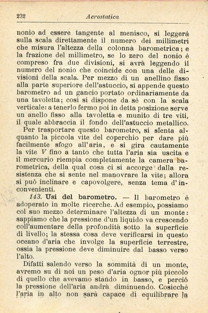 143. Usi del barometro. — Il barometro è adoperato in molte ricerche. Ad esempio, possiamo col suo mezzo determinare l'altezza di un monte : sappiamo che la pressione d'un liquido va crescendo coll'aumentare della profondità sotto la superficie di livello; la stessa cosa deve verificarsi in questo oceano d'aria che involge la superfìcie terrestre, ossia la pressione deve diminuire dal basso verso l'alto.