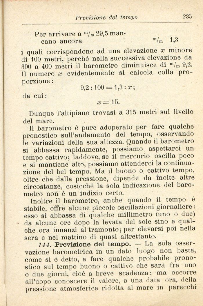 HI. Previsione del tempo. — La sola osservazione barometrica in un dato luogo non basta, come si è detto, a fare qualche probabile pronostico sul tempo buono o cattivo che sarà fra uno o due giorni, cioè a breve scadenza ; ma occorre all'uopo conoscere il valore, a una data ora, della pressione atmosferica ridotta al mare in parecchi