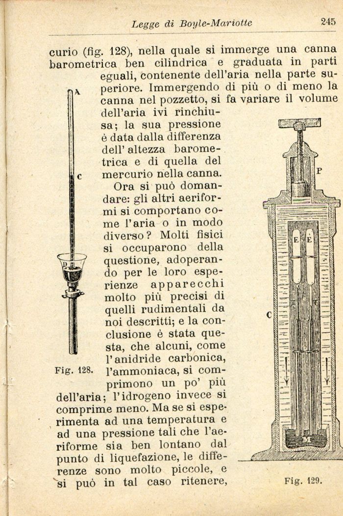 curio (fig. 128), nella quale si immerge una canna barometrica ben cilindrica e graduata in parti eguali, contenente dell'aria nella parte superiore. Immergendo di più o di meno la canna nel pozzetto, si fa variare il volume dell'aria ivi rinchiusa; la sua pressione è data dalla differenza dell' altezza barometrica e di quella del mercurio nella canna.