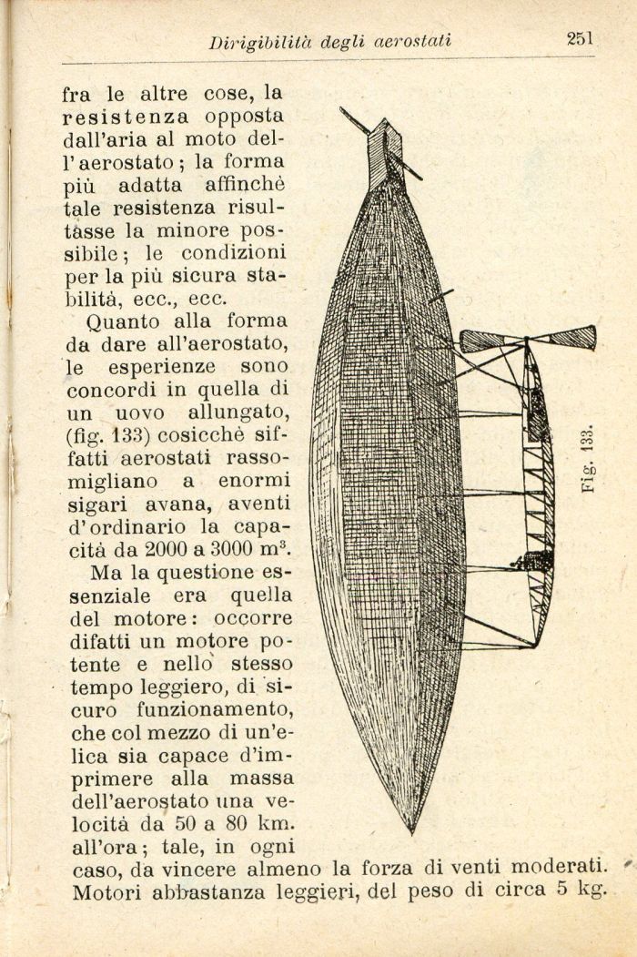 Ma la questione essenziale era quella del motore : occorre difatti un motore potente e nello' stesso tempo leggiero, di sicuro funzionamento, che col mezzo di un'elica sia capace d'imprimere alla massa dell'aerostato una velocità da 50 a 80 km. all'ora ; tale, in ogni caso, dà vincere almeno la forza di venti moderati. Motori abbastanza leggieri, del peso di circa 5 kg.