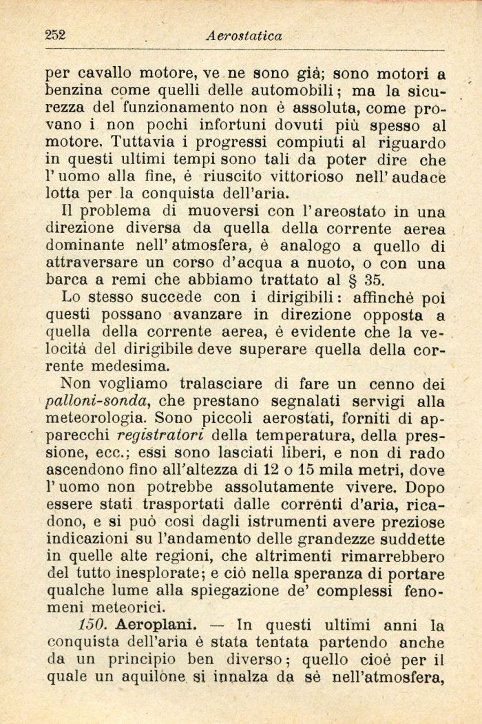 Non vogliamo tralasciare di fare un cenno dei palloni-sonda, che prestano segnalati servigi alla meteorologia. Sono piccoli aerostati, forniti di apparecchi registratori della temperatura, della pressione, ecc.: essi sono lasciati liberi, e non di rado ascendono fino all'altezza di 12 o 15 mila metri, dove l'uomo non potrebbe assolutamente vivere. Dopo essere stati trasportati dalle correnti d'aria, ricadono, e si può cosi dagli istrumenti avere preziose indicazioni su l'andamento delle grandezze suddette in quelle alte regioni, che altrimenti rimarrebbero del tutto inesplorate; e ciò nella speranza di portare qualche lume alla spiegazione de' complessi fenomeni meteorici.