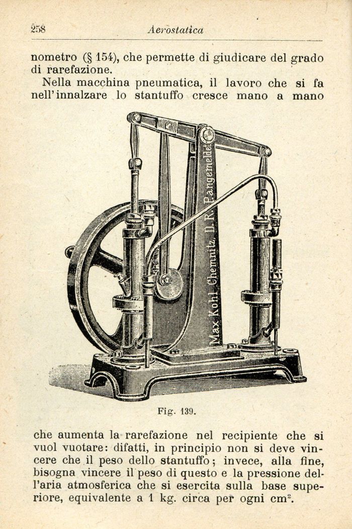che aumenta la rarefazione nel recipiente che si vuol vuotare: difatti, in principio non si deve vincere che il peso dello stantuffo ; invece, alla fine, bisogna vincere il peso di questo e la pressione dell'aria atmosferica che si esercita sulla base superiore, equivalente a 1 kg. circa per ogni cm=.