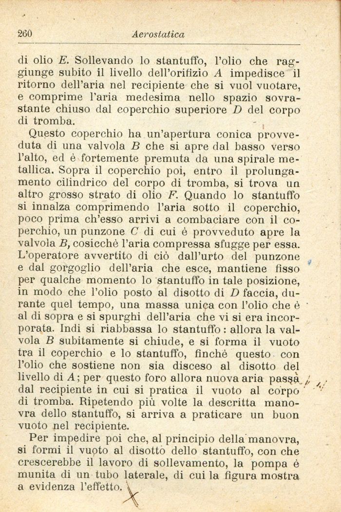 di olio E. Sollevando lo stantuffo, l'olio che raggiunge subito il livello dell'orifizio A impedisce il ritorno dell'aria nel recipiente che si vuol vuotare, e comprime l'aria medesima nello spazio sovrastante chiuso dal coperchio superiore D del corpo di tromba.
