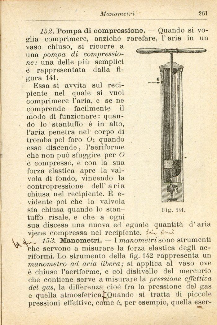Essa si avvita sul recipiente nel quale si vuol comprimere l'aria, e se ne comprende facilmente il modo di funzionare: quando lo stantuffo è in alto, l'aria penetra nel corpo di tromba pel foro O; quando esso discende, l'aeriforme che non può sfuggire per O è compresso, e con la sua forza elastica apre la valvola di fondo, vincendo la contropressione dell' aria chiusa nel recipiente. É e-vidente poi che la valvola sta chiusa quando lo stantuffo risale, e che a ogni sua discesa una nuova ed eguale quantità d' aria viene compressa nel recipiente.