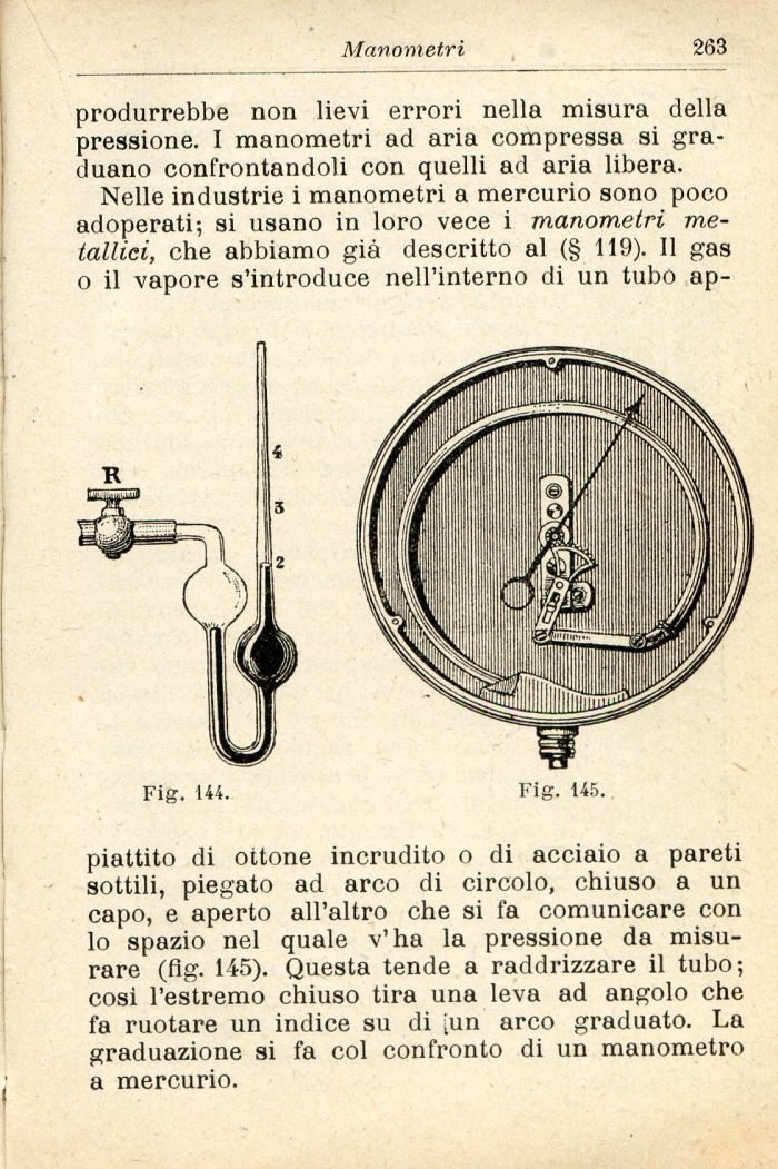 piattito di ottone incrudito o di acciaio a pareti sottili, piegato ad arco di circolo, chiuso a un capo, e aperto all'altro che si fa comunicare con lo spazio nel quale v'ha la pressione da misurare (fig. 145). Questa tende a raddrizzare il tubo; cosi l'estremo chiuso tira una leva ad angolo che fa ruotare un indice su di [un arco graduato. La graduazione si fa col confronto di un manometro a mercurio.