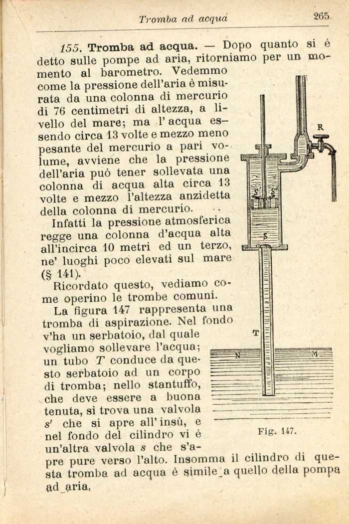 155. Tromba acì aequa. — Dopo quanto si è detto sulle pompe ad aria, ritorniamo per un momento al barometro. Vedemmo come la pressione dell'aria è misurata da una colonna di mercurio di 76 centimetri di altezza, a livello del mare; ma l'acqua essendo circa 13 volte e mezzo meno pesante del mercurio a pari volume, avviene che la pressione dell'aria può tener sollevata una colonna di acqua alta circa 13 volte e mezzo l'altezza anzidetta della colonna di mercurio.