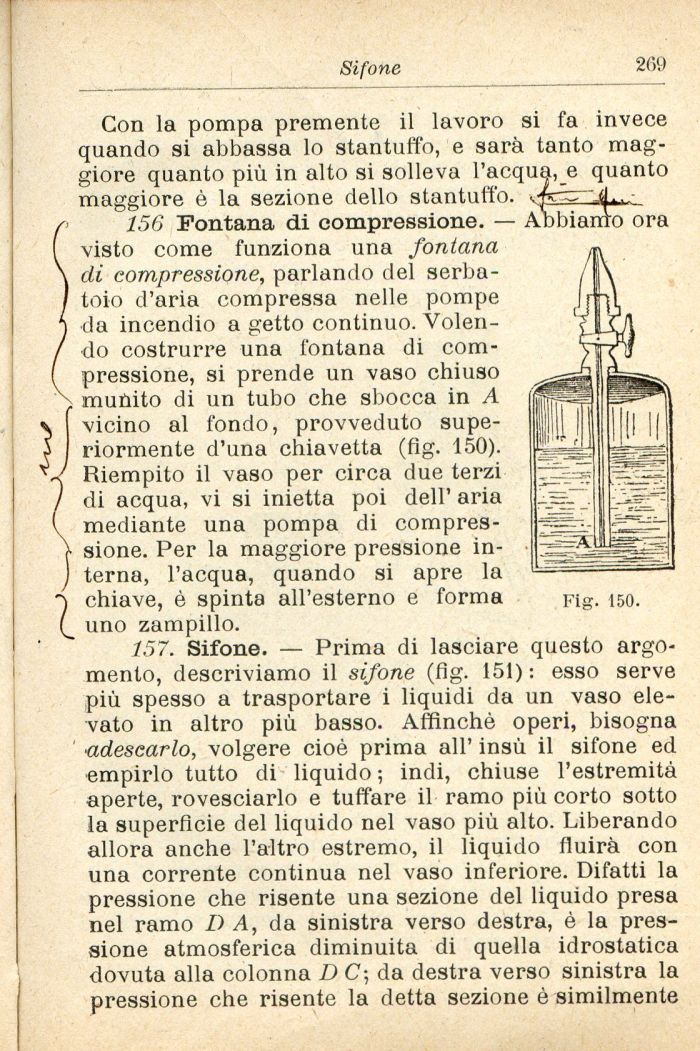 157. Sifone. — Prima di lasciare questo argomento, descriviamo il sifone (fig. 151): esso serve più spesso a trasportare i liquidi da un vaso elevato in altro più basso. Affinchè operi, bisogna •iadescarlo, volgere cioè prima all' insù il sifone ed empirlo tutto di liquido ; indi, chiuse l'estremità aperte, rovesciarlo e tuffare il ramo più corto sotto la superficie del liquido nel vaso più alto. Liberando allora anche l'altro estremo, il liquido fluirà con una corrente continua nel vaso inferiore. Difatti la pressione che risente una sezione del liquido presa nel ramo DA, da sinistra verso destra, è la pressione atmosferica diminuita di quella idrostatica dovuta alla colonna D C; da destra verso sinistra la pressione che risente la detta sezione è similmente