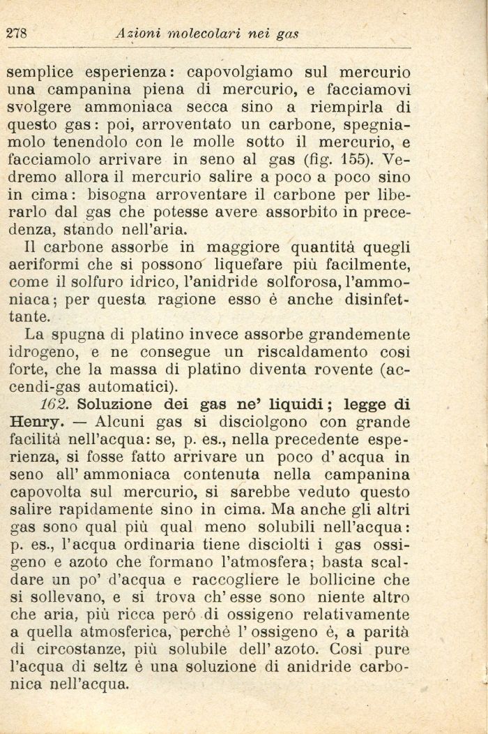 162. Soluzione dei gas ne' liquidi ; legge di Henry. — Alcuni gas si disciolgono con grande facilità nell'acqua: se, p. es., nella precedente esperienza, si fosse fatto arrivare un poco d' acqua in seno all' ammoniaca contenuta nella campanina capovolta sul mercurio, si sarebbe veduto questo salire rapidamente sino in cima. Ma anche gli altri gas sono qual più qual meno solubili nell'acqua : p. es., l'acqua ordinaria tiene disciolti i gas ossigeno e azoto che formano l'atmosfera; basta scaldare un po' d'acqua e raccogliere le bollicine che si sollevano, e si trova eh' esse sono niente altro che aria, più ricca però di ossigeno relativamente a quella atmosferica, perchè 1' ossigeno è, a parità di circostanze, più solubile dell' azoto. Cosi pure l'acqua di seltz è una soluzione di anidride carbonica nell'acqua.
