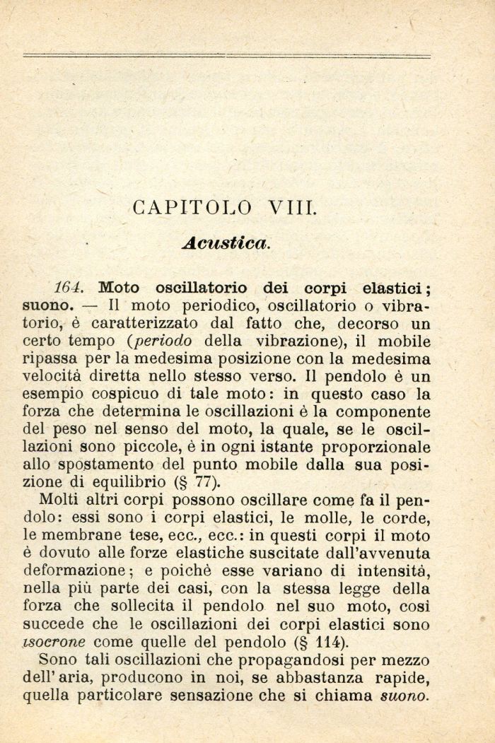 Molti altri corpi possono oscillare come fa il pendolo: essi sono i corpi elastici, le molle, le corde, le membrane tese, ecc., ecc.: in questi corpi il moto è dovuto alle forze elastiche suscitate dall'avvenuta deformazione; e poiché esse variano di intensità, nella più parte dei casi, con la stessa legge della forza che sollecita il pendolo nel suo moto, cosi succede che le oscillazioni dei corpi elastici sono isocrone come quelle del pendolo (§ 114).