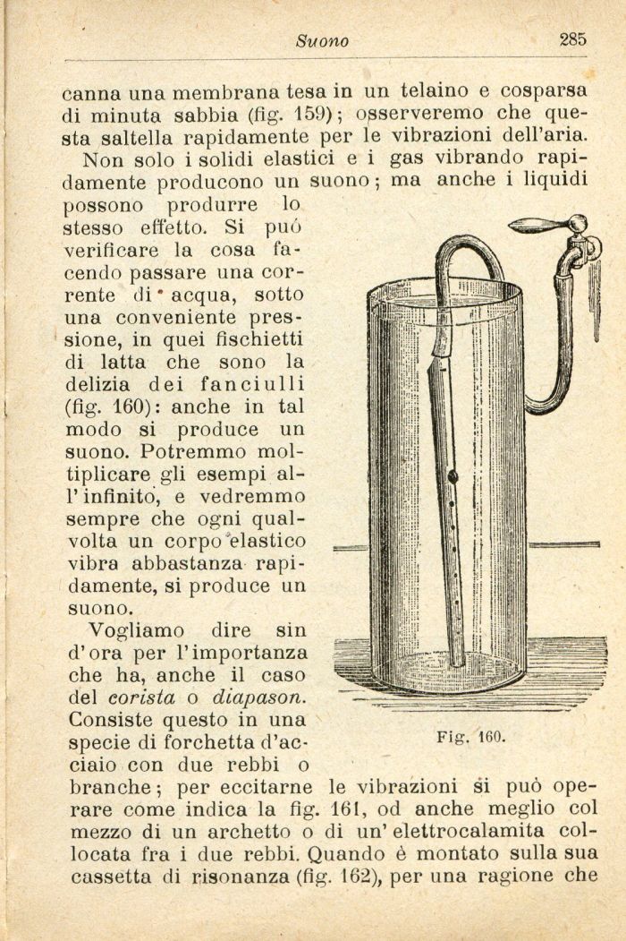 Non solo i solidi elastici e i gas vibrando rapidamente producono un suono ; ma anche i liquidi possono produrre lo stesso effetto. Si può verificare la cosa facendo passare una corrente di acqua, sotto una conveniente pressione, in quei fischietti di latta che sono la delizia dei fanciulli (flg. 160): anche in tal modo si produce un suono. Potremmo moltiplicare gli esempi all' infinito, e vedremmo sempre che ogni qualvolta un corpo'elastico vibra abbastanza rapidamente, si produce un suono.