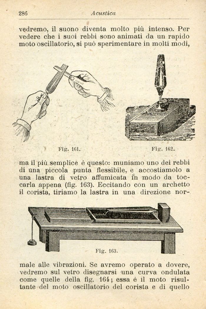 male alle vibrazioni. Se avremo operato a dovere, vedremo sul vetro disegnarsi una curva ondulata come quelle della fig. 164; essa è il moto risultante del moto oscillatorio del corista e di quello