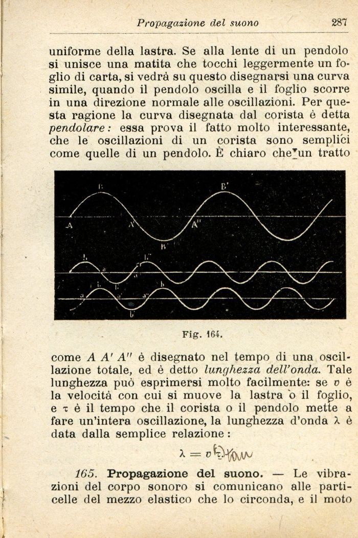 come A A' A è disegnato nel tempo di una oscillazione totale, ed è detto lunghezza dell'onda. Tale lunghezza può esprimersi molto facilmente: se v è la velocità con cui si muove la lastra o il foglio, e x è il tempo che il corista o il pendolo mette a fare un'intera oscillazione, la lunghezza d'onda X è data dalla semplice relazione :