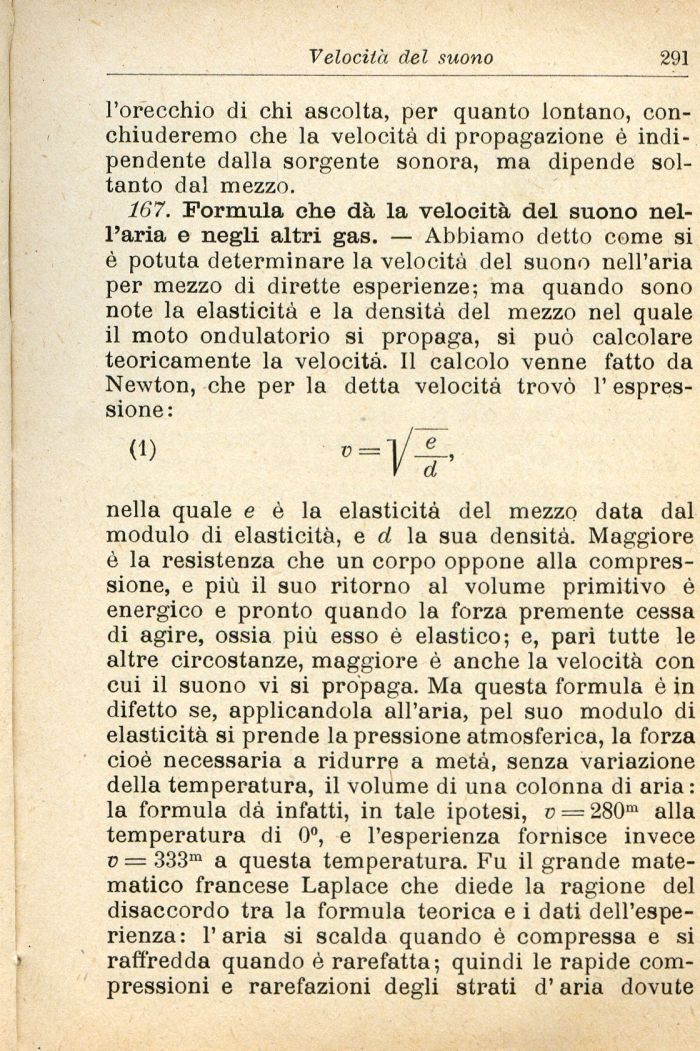 167. Formula che dà la velocità del suono nell'aria e negli altri gas. — Abbiamo detto come si è potuta determinare la velocità del suono nell'aria per mezzo di dirette esperienze; ma quando sono note la elasticità e la densità del mezzo nel quale il moto ondulatorio si propaga, si può calcolare teoricamente la velocità. Il calcolo venne fatto da Newton, che per la detta velocità trovò 1' espressione: