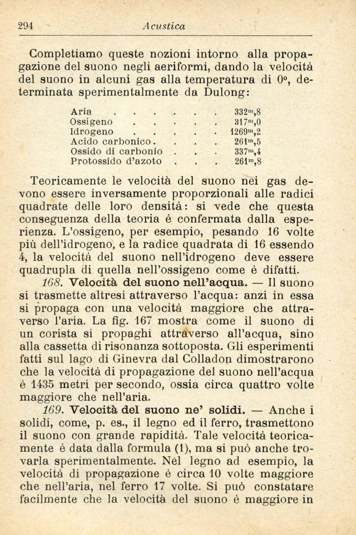 169. Velocità del suono ne' solidi. — Anche i solidi, come, p. es., il legno ed il ferro, trasmettono il suono con grande rapidità. Tale velocità teoricamente è data dalla formula (1), ma si può anche trovarla sperimentalmente. Nel legno ad esempio, la velocità di propagazione è circa 10 volte maggiore che nell'aria, nel ferro 17 volte. Si può constatare facilmente che la velocità del suono è maggiore in