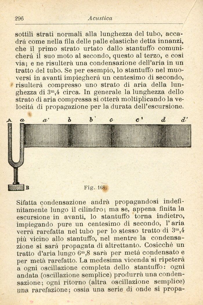 Sifatta condensazione andrà propagandosi indefinitamente lungo il cilindro; ma se, appena finita la escursione in avanti, lo stantuffo torna indietro, impiegando pure un centesimo di secondo, l'aria verrà rarefatta nel tubo per lo stesso tratto di 3m,4 più vicino allo stantuffo, nel mentre la condensazione si sarà propagata di altrettanto. Cosicché un tratto d'aria lungo 6m,8 sarà per metà condensato e per metà rarefatto. La medesima vicenda si ripeterà a ogni oscillazione completa dello stantuffo: ogni andata (oscillazione semplice) produrrà una condensazione; ogni ritorno (altra oscillazione semplice) una rarefazione; ossia una serie di onde si propa-