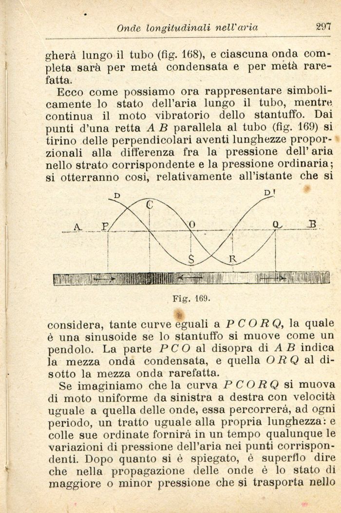 Se imaginiamo che la curva PCORQ si muova di moto uniforme da sinistra a destra con velocità uguale a quella delle onde, essa percorrerà, ad ogni periodo, un tratto uguale alla propria lunghezza: e colle sue ordinate fornirà in un tempo qualunque le variazioni di pressione dell'aria nei punti corrispondenti. Dopo quanto si è spiegato, è superilo dire che nella propagazione delle onde è lo stato di maggiore o minor pressione che si trasporta nello