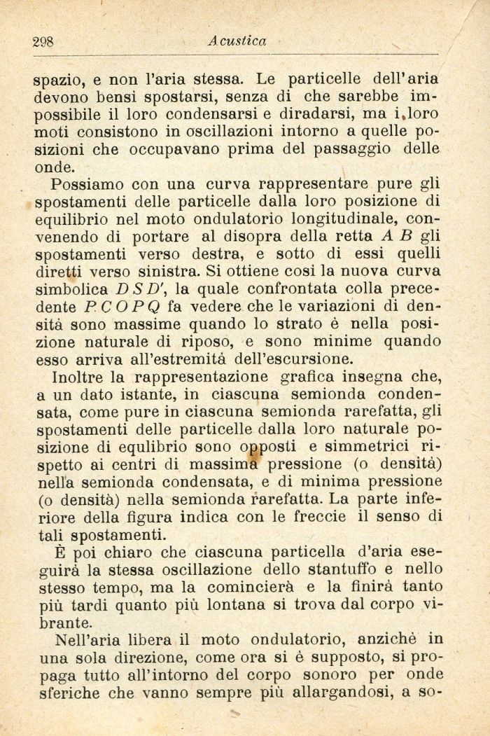 Possiamo con una curva rappresentare pure gli spostamenti delle particelle dalla loro posizione di equilibrio nel moto ondulatorio longitudinale, convenendo di portare al disopra della retta A B gli spostamenti verso destra, e sotto di essi quelli diretti verso sinistra. Si ottiene cosi la nuova curva simbolica BSD', la quale confrontata colla precedente PCOPQ fa vedere che le variazioni di densità sono massime quando lo strato è nella posizione naturale di riposo, e sono minime quando esso arriva all'estremità dell'escursione.