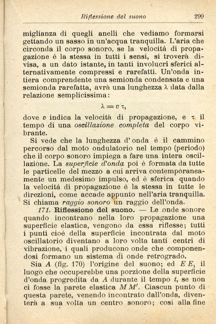 171. Riflessione del suono. — Le onde sonore quando incontrano nella loro propagazione una superficie elastica, vengono da essa riflesse; tutti i punti cioè della superficie incontrata dal moto oscillatorio diventano a loro volta tanti centri di vibrazione, i quali producono onde che componendosi formano un sistema di onde retrogrado.