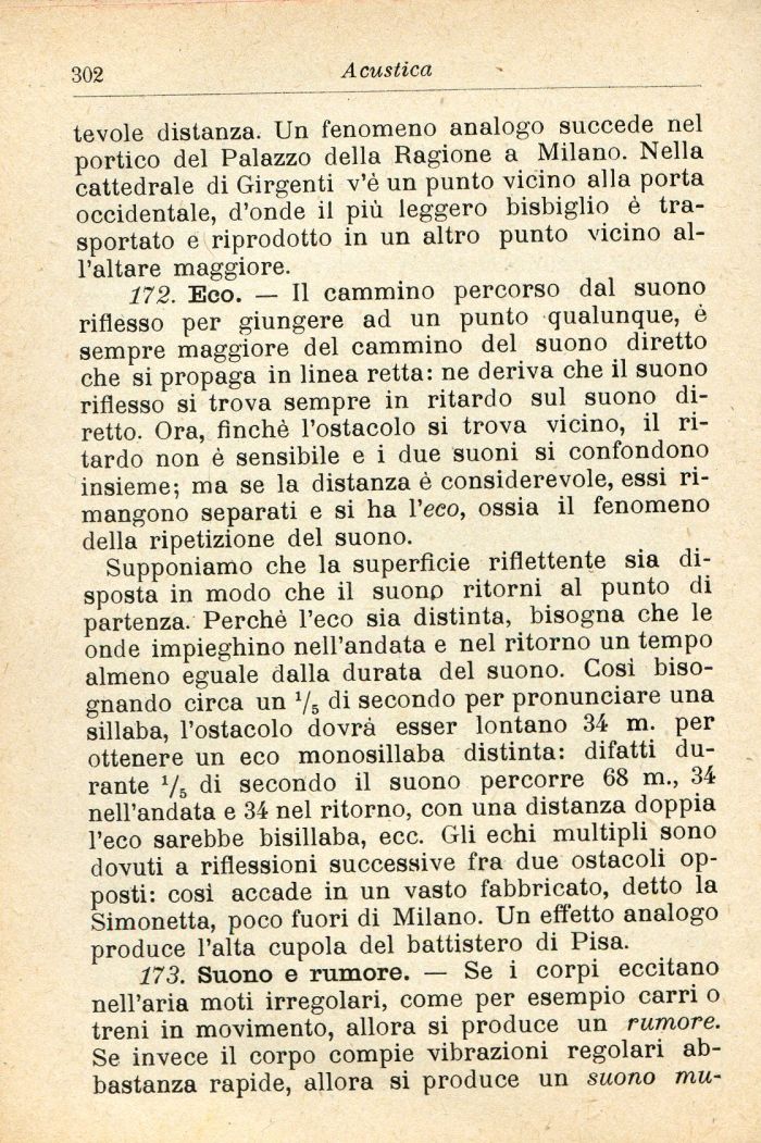 172. Eeo. — Il cammino percorso dal suono riflesso per giungere ad un punto qualunque, è sempre maggiore del cammino del suono diretto che si propaga in linea retta: ne deriva che il suono riflesso si trova sempre in ritardo sul suono diretto. Ora, finché l'ostacolo si trova vicino, il ritardo non è sensibile e i due suoni si confondono insieme; ma se la distanza è considerevole, essi rimangono separati e si ha l'eco, ossia il fenomeno della ripetizione del suono.