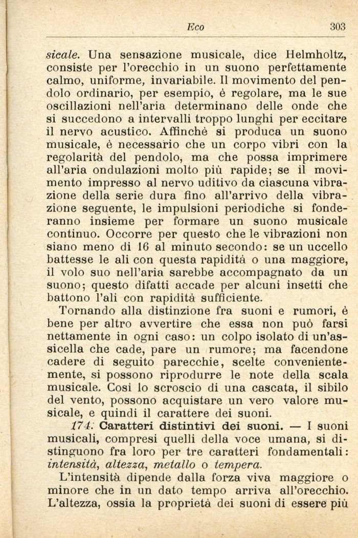 174: Caratteri distintivi dei suoni. — I suoni musicali, compresi quelli della voce umana, si distinguono fra loro per tre caratteri fondamentali : intensità, altezza, metallo o tempera.