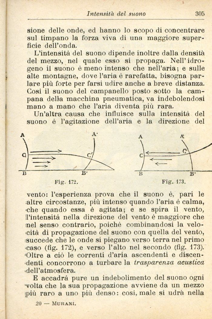 vento: l'esperienza prova che il suono è, pari le altre circostanze, più intenso quando l'aria è calma, ¦che quando essa è agitata; e se spira il vento, 2'intensità nella direzione del vento è maggiore che mei senso contrario, poiché combinandosi la velocità di propagazione del suono con quella del vento, succede che le onde si piegano verso terra nel primo ¦caso (fig. 172), e verso l'alto nel secondo (fig. 173). 'Oltre a ciò le correnti d'aria ascendenti e discendenti concorrono a turbare la trasparenza acustica ¦dell'atmosfera.