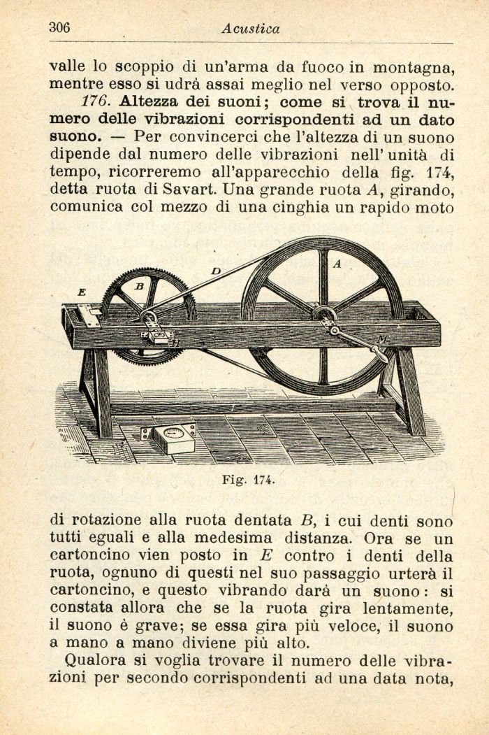 176. Altezza dei suoni; come si trova il numero delle vibrazioni corrispondenti ad un dato suono. — Per convincerci che l'altezza di un suono dipende dal numero delle vibrazioni nell' unità di tempo, ricorreremo all'apparecchio della fig. 174, detta ruota di Savart. Una grande ruota A, girando, comunica col mezzo di una cinghia un rapido moto