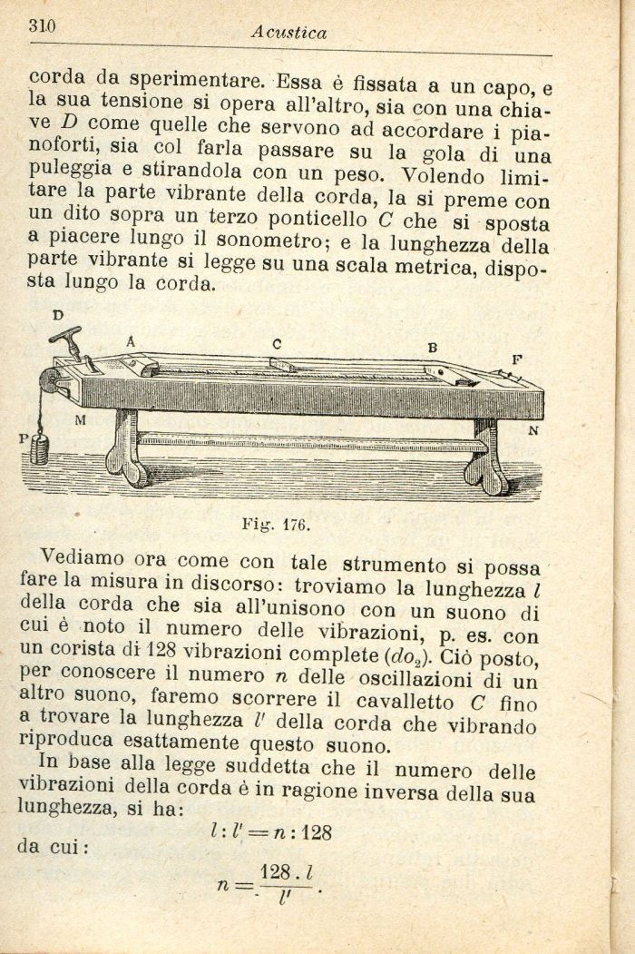 Vediamo ora come con tale strumento si possa fare la misura in discorso: troviamo la lunghezza l della corda che sia all'unisono con un suono di cui è noto il numero delle vibrazioni, p. es. con un corista di 128 vibrazioni complete (e?o2). Ciò posto, per conoscere il numero n delle oscillazioni di un altro suono, faremo scorrere il cavalletto C fino a trovare la lunghezza V della corda che vibrando riproduca esattamente questo suono.