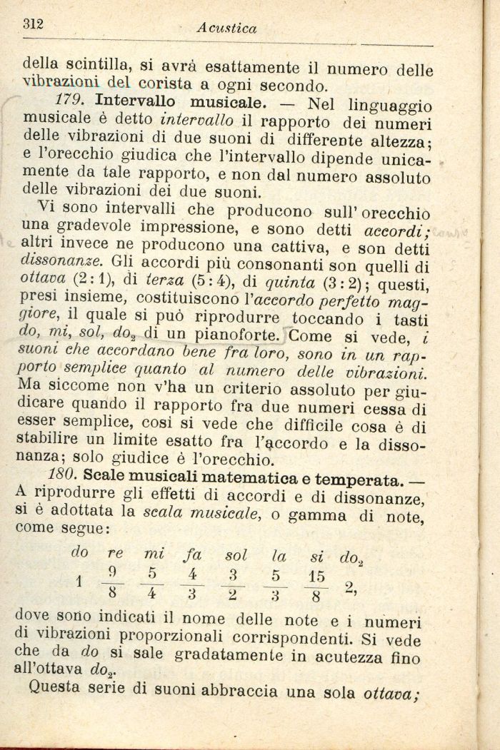 180. Scale musicali matematica e temperata. — A riprodurre gli effetti di accordi e di dissonanze, si è adottata la scala musicale, o gamma di note, come segue: