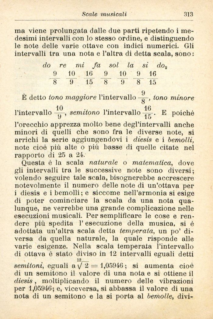Questa è la scala naturale o matematica, dove gli intervalli tra le successive note sono diversi; volendo seguire tale scala, bisognerebbe accrescere notevolmente il numero delle note di un'ottava per i diesis e i bemolli; e siccome nell'armonia si esige di poter cominciare la scala da una nota qualunque, ne verrebbe una grande complicazione nelle esecuzioni musicali. Per semplificare le cose e rendere più spedita l'esecuzione della musica, si è adottata un'altra scala detta temperata, un po' diversa da quella naturale, la quale risponde alle varie esigenze. Nella scala temperata l'intervallo di ottava è stato diviso in 12 intervalli eguali detti 12_