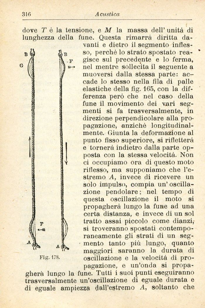 massa dell' unità di rimarrà diritta davanti e dietro il segmento inflesso, perchè lo strato spostato reagisce sul precedente e lo ferma, nel mentre sollecita il seguente a muoversi dalla stessa parte: accade lo stesso nella fila di palle elastiche della fig. 165, con la differenza però che nel caso della fune il movimento dei vari segmenti si fa trasversalmente, in direzione perpendicolare alla propagazione, anziché longitudinalmente. Giunta la deformazione al punto fisso superiore, si rifletterà e tornerà indietro dalla parte opposta con la stessa velocità. Non ci occupiamo ora di questo moto riflesso, ma supponiamo che l'estremo A, invece di ricevere un solo impulso, compia un' oscillazione pendolare ; nel tempo di questa oscillazione il moto si propagherà lungo la fune ad una certa distanza, e invece di un sol tratto assai piccolo come dianzi, si troveranno spostati contemporaneamente gli strati di un segmento tanto più lungo, quanto maggiori saranno la durata di oscillazione e la velocità di propagazione, e un'onda si propagherà lungo la fune. Tutti i suoi punti eseguiranno trasversalmente un'oscillazione di eguale durata e di eguale ampiezza dall'estremo A, soltanto che