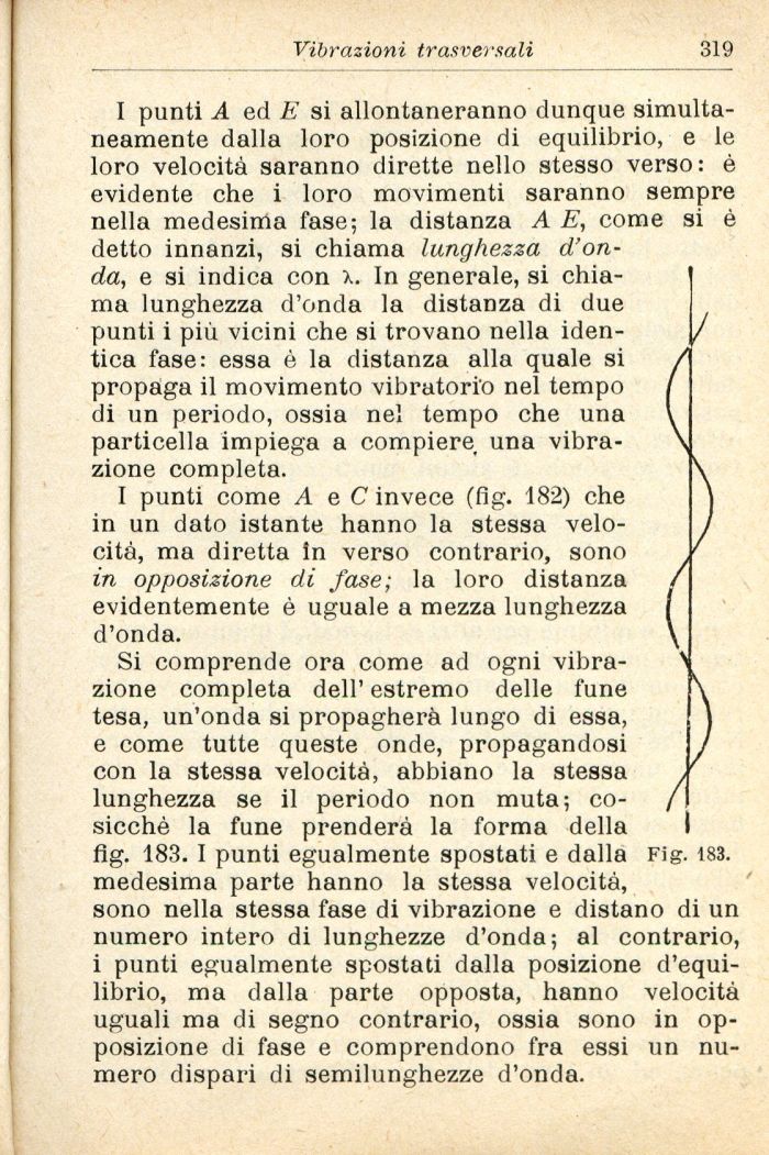 Si comprende ora come ad ogni vibrazione completa dell' estremo delle fune tesa, un'onda si propagherà lungo di essa, e come tutte queste onde, propagandosi con la stessa velocità, abbiano la stessa , lunghezza se il periodo non muta; co- / sicché la fune prenderà la forma della fig. 183. I punti egualmente spostati e dalla Fig. 183. medesima parte hanno la stessa velocità, sono nella stessa fase di vibrazione e distano di un numero intero di lunghezze d'onda; al contrario, i punti egualmente spostati dalla posizione d'equilibrio, ma dalla parte opposta, hanno velocità uguali ma di segno contrario, ossia sono in opposizione di fase e comprendono fra essi un numero dispari di semilunghezze d'onda.