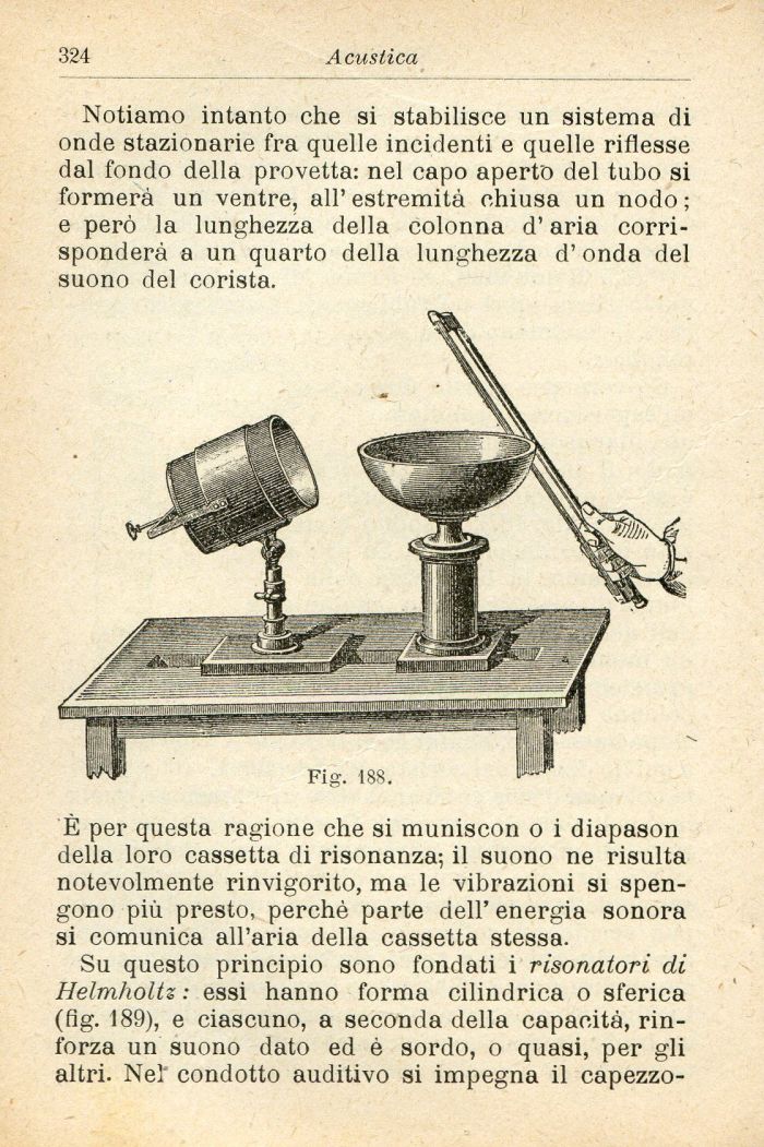 Su questo principio sono fondati i risonatori di HelmholU : essi hanno forma cilindrica o sferica (fig. 189), e ciascuno, a seconda della capacità, rinforza un suono dato ed è sordo, o quasi, per gli altri. Nel condotto auditivo si impegna il capezzo-