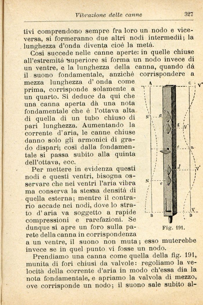 Prendiamo una canna come quella della fig. 191, munita di fori chiusi da valvole: regoliamo la velocità della corrente d'aria in modo ch'essa dia la nota fondamentale, e apriamo la valvola di mezzo, ove corrisponde un nodo; il suono sale subito al-