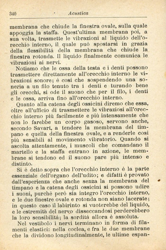membrana che chiude la finestra ovale, sulla quale appoggia la staffa. Quest'ultima membrana poi, a sua volta, trasmette le vibrazioni al liquido dell'orecchio interno, il quale può spostarsi in grazia della flessibilità della membrana che chiude la finestra rotonda. Il liquido finalmente comunica le vibrazioni ai nervi.