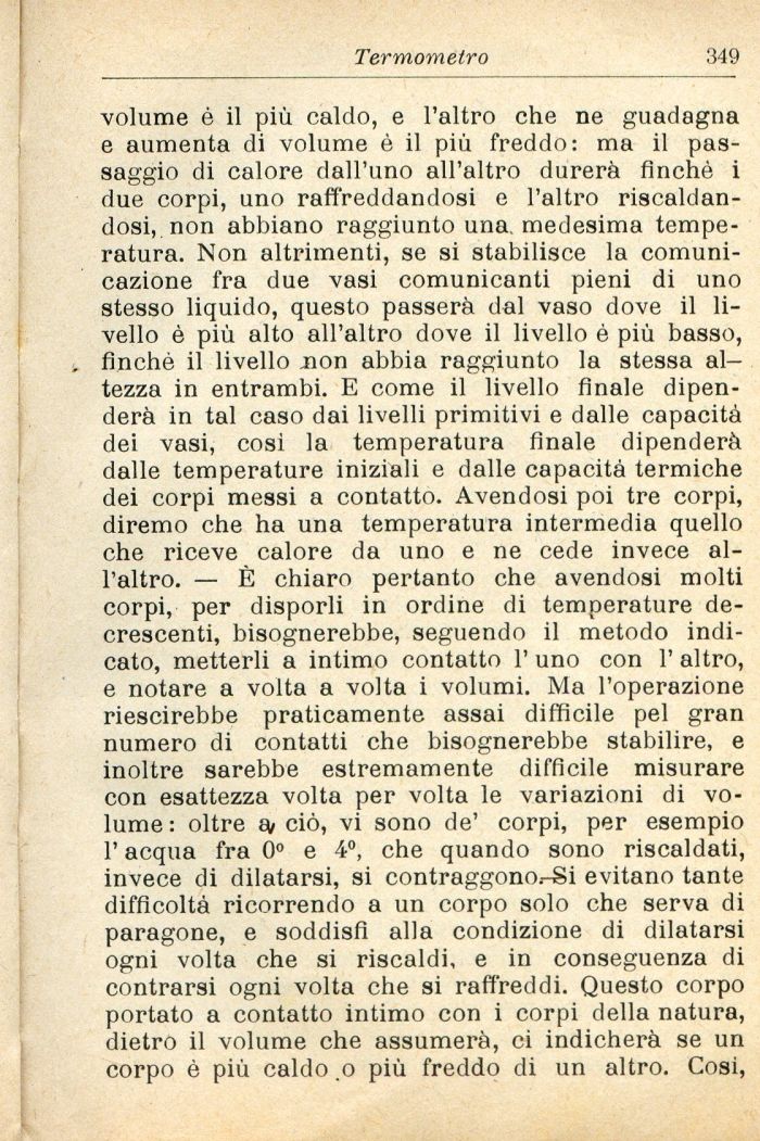 volume ó il più caldo, e l'altro che ne guadagna e aumenta di volume è il più freddo: ma il passaggio di calore dall'uno all'altro durerà finché i due corpi, uno raffreddandosi e l'altro riscaldandosi, non abbiano raggiunto una medesima temperatura. Non altrimenti, se si stabilisce la comunicazione fra due vasi comunicanti pieni di uno stesso liquido, questo passerà dal vaso dove il livello è più alto all'altro dove il livello è più basso, finché il livello non abbia raggiunto la stessa altezza in entrambi. E come il livello finale dipenderà in tal caso dai livelli primitivi e dalle capacità dei vasi, cosi la temperatura finale dipenderà dalle temperature iniziali e dalle capacità termiche dei corpi messi a contatto. Avendosi poi tre corpi, diremo che ha una temperatura intermedia quello che riceve calore da uno e ne cede invece all'altro. — È chiaro pertanto che avendosi molti corpi, per disporli in ordine di temperature decrescenti, bisognerebbe, seguendo il metodo indicato, metterli a intimo contatto 1' uno con 1' altro, e notare a volta a volta i volumi. Ma l'operazione riescirebbe praticamente assai difficile pel gran numero di contatti che bisognerebbe stabilire, e inoltre sarebbe estremamente difficile misurare con esattezza volta per volta le variazioni di volume : oltre aj ciò, vi sono de' corpi, per esempio l'acqua fra 0° e 4°, che quando sono riscaldati, invece di dilatarsi, si contraggono.-Si evitano tante difficoltà ricorrendo a un corpo solo che serva di paragone, e soddisfi alla condizione di dilatarsi ogni volta che si riscaldi, e in conseguenza di contrarsi ogni volta che si raffreddi. Questo corpo portato a contatto intimo con i corpi della natura, dietro il volume che assumerà, ci indicherà se un corpo è più caldo .o più freddo di un altro. Cosi,