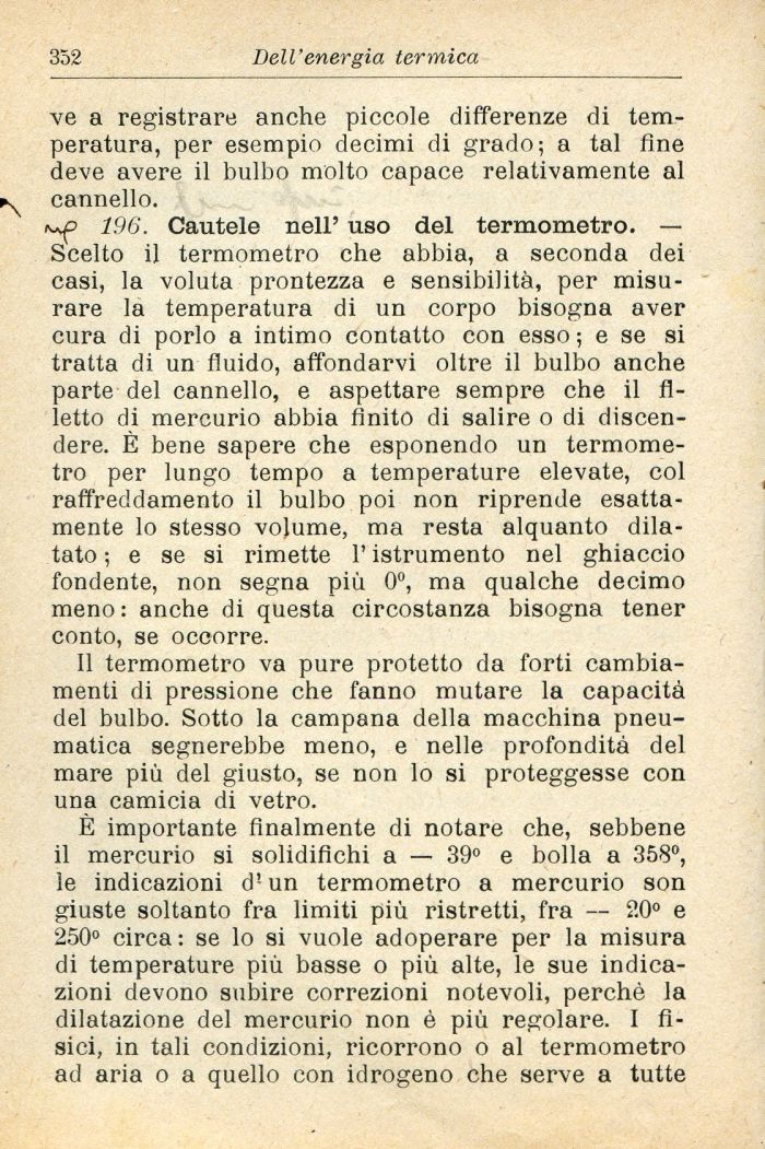 È importante finalmente di notare che, sebbene il mercurio si solidifichi a — 39° e bolla a 358°, le indicazioni d'un termometro a mercurio son giuste soltanto fra limiti più ristretti, fra — 20° e 250° circa : se lo si vuole adoperare per la misura di temperature più basse o più alte, le sue indicazioni devono subire correzioni notevoli, perchè la dilatazione del mercurio non è più regolare. I fisici, in tali condizioni, ricorrono o al termometro ad aria o a quello con idrogeno che serve a tutte