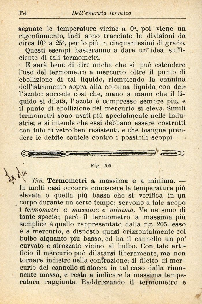198. Termometri a massima e a minima. — In molti casi occorre conoscere la temperatura più elevata o quella più bassa che si verifica in un corpo durante un certo tempo: servono a tale scopo i termometri a massima e minima. Ve ne sono di tante specie; però il termometro a massima più semplice è quello rappresentato dalla fig. 205: esso è a mercurio, è disposto quasi orizzontalmente col bulbo alquanto più basso, ed ha il cannello un po' curvato e strozzato vicino al bulbo. Con tale artificio il mercurio può dilatarsi liberamente, ma non tornare indietro nella confrazione; il filetto di mercurio del cannello si stacca in tal caso dalla rimanente massa, e resta a indicare la massima temperatura raggiunta. Raddrizzando il termometro e