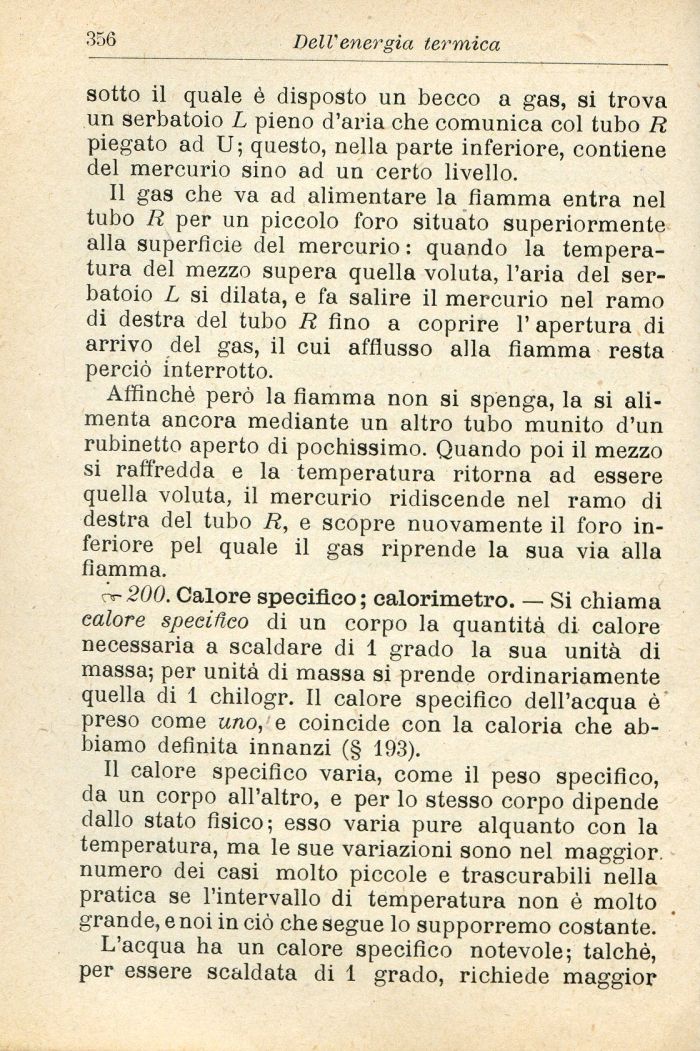 r*-200. Calore specifico; calorimetro. — Si chiama calore specifico di un corpo la quantità di calore necessaria a scaldare di 1 grado la sua unità di massa; per unità di massa si prende ordinariamente quella di 1 chilogr. Il calore specifico dell'acqua è preso come uno, e coincide con la caloria che abbiamo definita innanzi (§ 193).