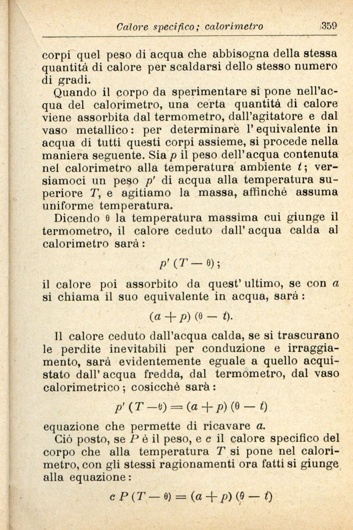 Quando il corpo da sperimentare si pone nell'acqua del calorimetro, una certa quantità di calore viene assorbita dal termometro, dall'agitatore e dal vaso metallico : per determinare l'equivalente in acqua di tutti questi corpi assieme, si procede nella maniera seguente. Sia p il peso dell'acqua contenuta nel calorimetro alla temperatura ambiente t ; versiamoci un peso p' di acqua alla temperatura superiore T, e agitiamo la massa, affinchè assuma uniforme temperatura.