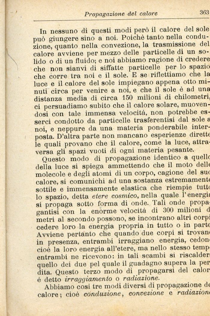 In nessuno di questi modi però il calore del sole può giungere sino a noi. Poiché tanto nella conduzione, quanto nella convezione, la trasmissione del calore avviene per mezzo delle particelle di un solido o di un fluido; e noi abbiamo ragione di credere che non sianvi di siffatte particelle per lo spazio che corre tra noi e il sole. E se riflettiamo che la luce e il calore del sole impiegano appena otto minuti circa per venire a noi, e che il sole è ad una distanza media di circa 150 milioni di chilometri, ci persuadiamo subito che il calore solare, muovendosi con tale immensa velocità, non potrebbe esserci condotto da particelle trasferentisi dal sole e noi, e neppure da una materia ponderabile interposta. D'altra parte non mancano esperienze dirette le quali provano che il calore, come la luce, attraversa gli spazi vuoti di ogni materia pesante.