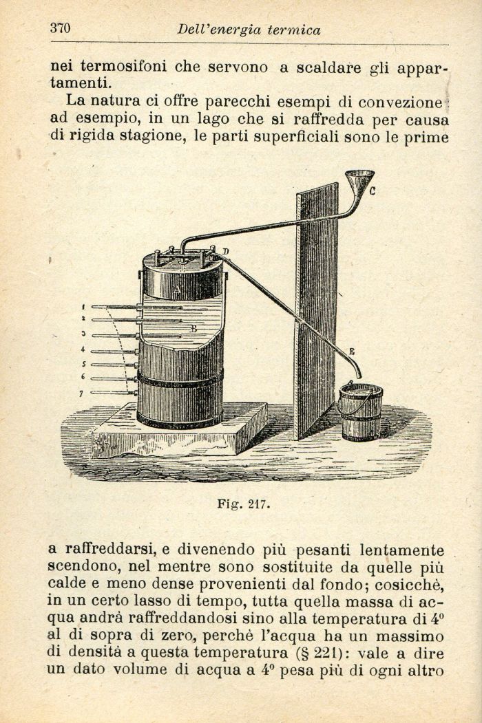 a raffreddarsi, e divenendo più pesanti lentamente scendono, nel mentre sono sostituite da quelle più calde e meno dense provenienti dal fondo; cosicché, in un certo lasso di tempo, tutta quella massa di acqua andrà raffreddandosi sino alla temperatura di 4° al di sopra di zero, perchè l'acqua ha un massimo di densità a questa temperatura (§221): vale a dire un dato volume di acqua a 4° pesa più di ogni altro