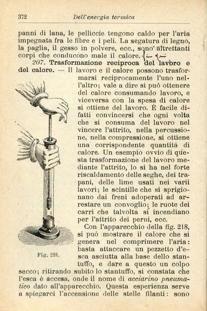 207. Trasformazione reciproca del lavbro e del calore. — Il lavoro e il calore possono trasformarsi reciprocamente l'uno nell'altro; vale a dire si può ottenere del calore consumando lavoro, e viceversa con la spesa di calore si ottiene del lavoro. È facile difatti convincersi che ogni volta che si consuma del lavoro nel vincere l'attrito, nella percussione, nella compressione, si ottiene una corrispondente quantità di calore. Un esempio ovvio di questa trasformazione del lavoro mediante l'attrito, lo si ha nel forte riscaldamento delle seghe, dei trapani, delle lime usati nei varii lavori; le scintille che si sprigionano dai freni adoperati ad arrestare un convoglio; le ruote dei carri che talvolta si incendiano per l'attrito dei perni, ecc.