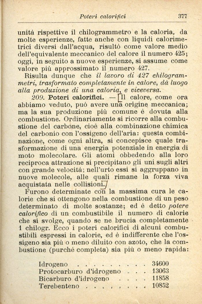 209. Poteri calorifici. — Fll calore, come ora abbiamo veduto, può avere una origine meccanica; ma la sua produzione più comune è dovuta alla combustione. Ordinariamente si ricorre alla combustione del carbone, cioè alla combinazione chimica del carbonio con l'ossigeno dell'aria: questa combinazione, come ogni altra, si concepisce quale trasformazione di una energia potenziale in energia di moto molecolare. Gli atomi obbedendo alla loro reciproca attrazione si precipitano gli uni sugli altri con grande velocità; nell'urto essi si aggruppano in nuove molecole, alle quali rimane la forza viva acquistata nelle collisioniT/