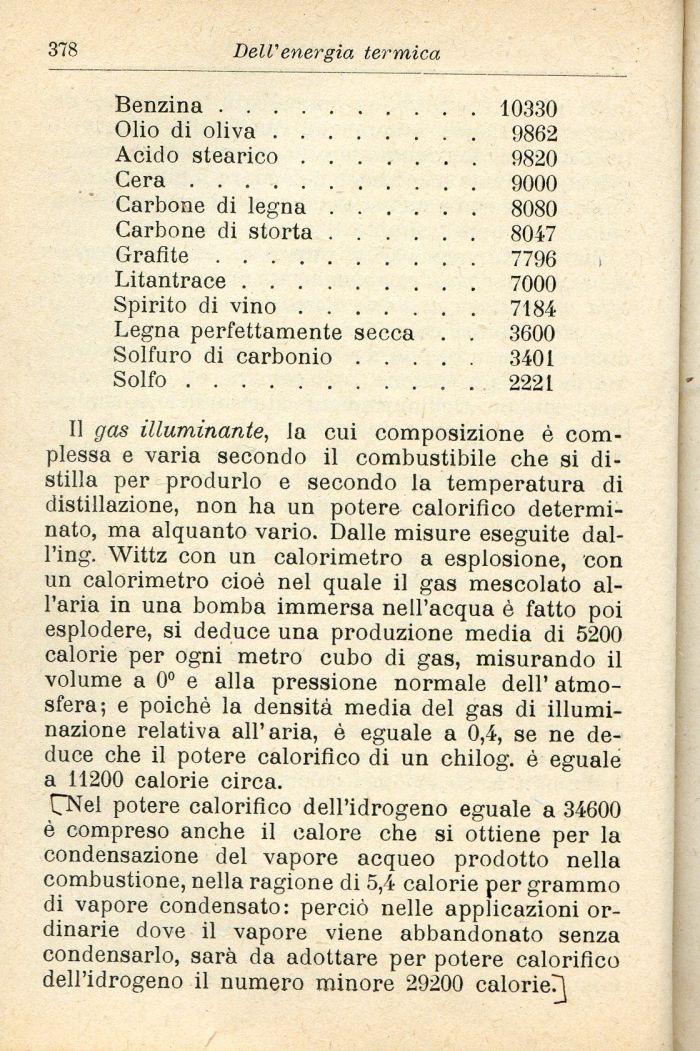 CNel potere calorifico dell'idrogeno eguale a 34600 è compreso anche il calore che si ottiene per la condensazione del vapore acqueo prodotto nella combustione, nella ragione di 5,4 calorie per grammo di vapore condensato: perciò nelle applicazioni ordinarie dove il vapore viene abbandonato senza condensarlo, sarà da adottare per potere calorifico dell'idrogeno il numero minore 29200 calorie?]