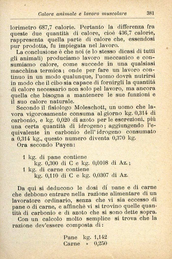 Secondo il fisiologo Moleschott, un uomo che lavora vigorosamente consuma al giorno kg. 0,314 di carbonio, e kg. 0,020 di azoto per le escrezioni, più una certa quantità di idrogeno ; aggiungendo l'equivalente in carbonio dell'idrogeno consumato a 0,314 kg., questo numero diventa 0,370 kg.